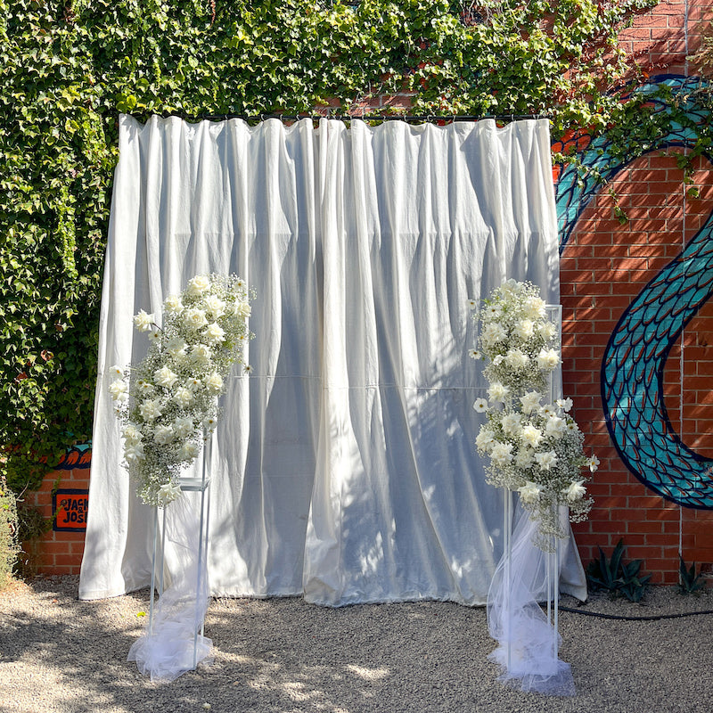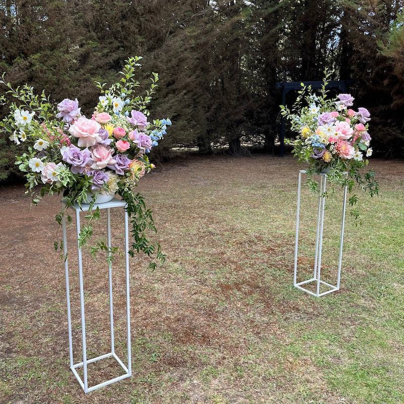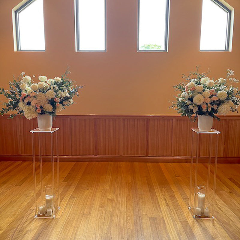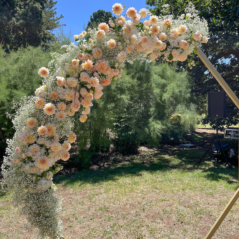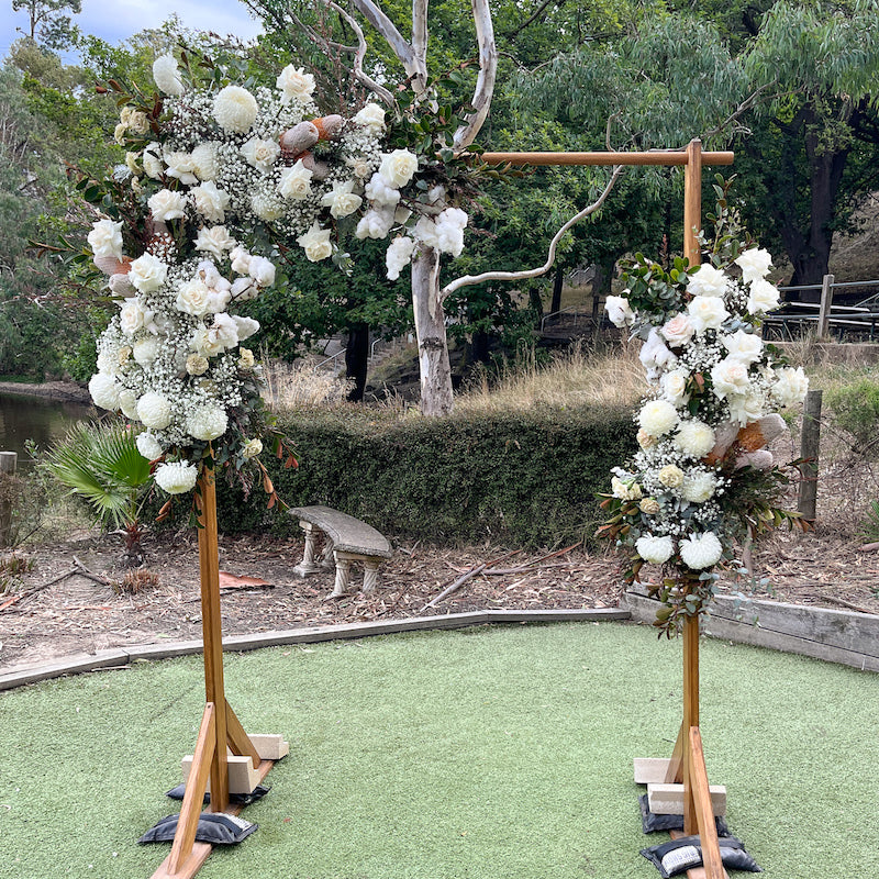 At the top of the aisle, you will often find a rectangular, circle, or abstract wedding arch or arbour. On their own, they are quite plain, made from timber or metal, but when adorned with quality flowers, create a stunning backdrop for your ceremony. They also look breathtaking in wedding photos.