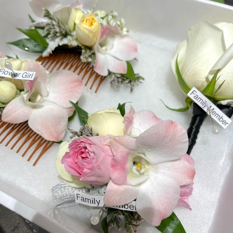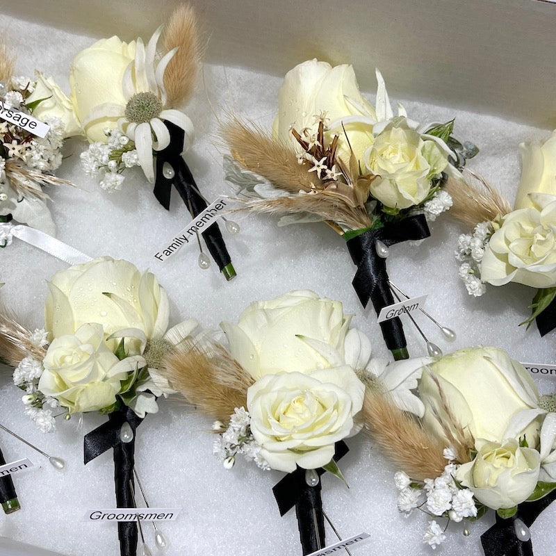 Your partner and the wedding party may like to wear a single flower - matching the bridal bouquet - in their buttonhole or corsages. This fashion statement is steeped in history, dating back as early as the 16th century.